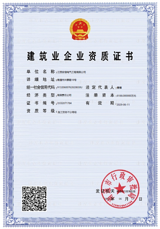 江蘇安信電氣工程有限公司,成立于2004年6月,注冊(cè)資金8188萬(wàn)元,占地22000平方米,位于南通市興泰路18號(hào),東接南通站、興東機(jī)場(chǎng),西鄰南通西站、滬蘇通公鐵長(zhǎng)江大橋,交通便捷。